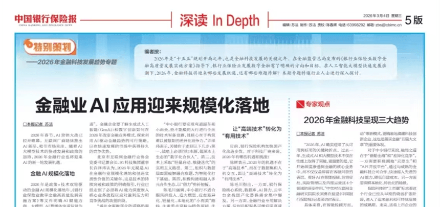 3月4日,《中国银行保险报》报纸、官网以“金融业AI应用迎来规模化落地”为题报道2026年金融科技发展趋势。